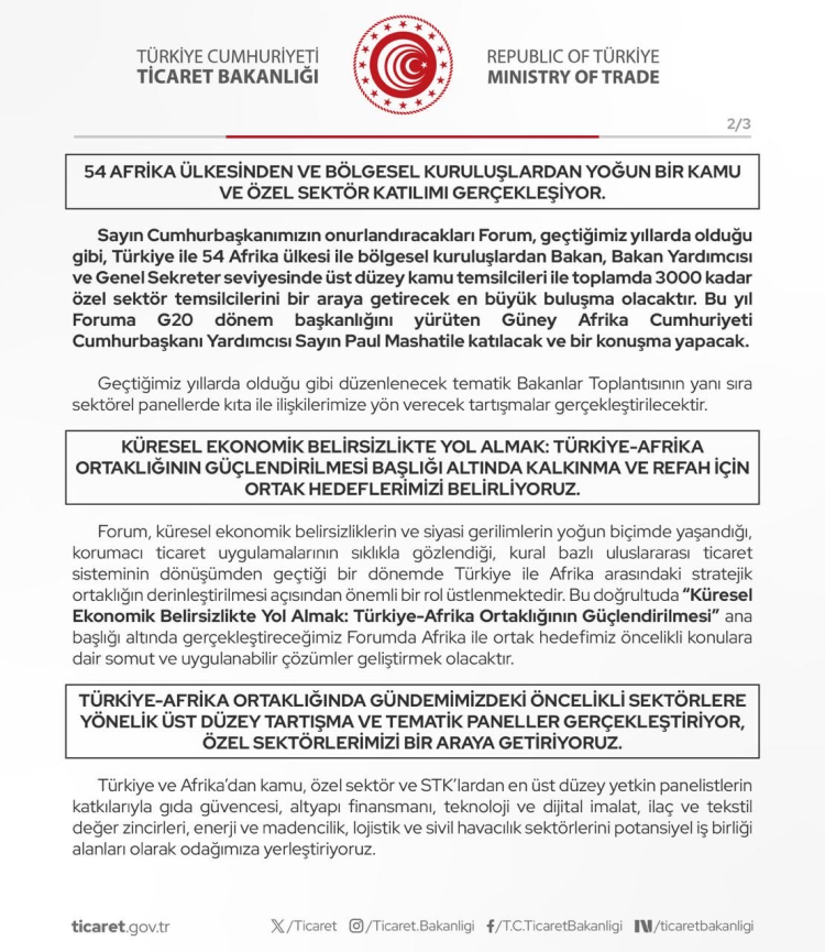 Ticaret Bakanlığı, “Türkiye-Afrika İlişkilerini Güçlendirerek Ortak Kazanımları Paylaşmak” mottosuyla V. Türkiye-Afrika İş ve Ekonomi Forumu, 16-17 Ekim 2025’te İstanbul Kongre Merkezi’nde (ICEC) düzenlenecek. Forum heyecanını paylaşan Bakanlık, Afrika ülkeleriyle ekonomik iş birliğini güçlendirmeyi hedeflediklerini kaydetti.
