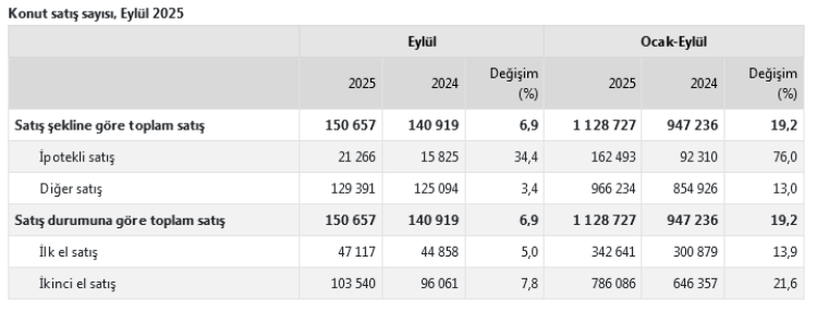TÜİK verilerine göre, Eylül 2025’te; ilk el satışlar yüzde 5,0 artışla 47 bin 117 adet (yüzde 31,3 pay), ikinci el satışlar yüzde 7,8 artışla 103 bin 540 adet (yüzde 68,7 pay) olurken, ipotekli satışlar yüzde 34,4 artışla 21 bin 266 adet (yüzde 14,1 pay), ilk el ipotekli satışlar 4 bin 978 adet oldu.