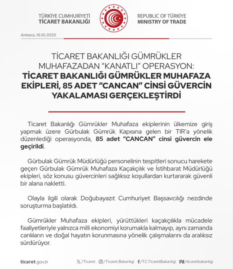 Ticaret Bakanlığı Gümrükler Muhafaza ekipleri, Ağrı’nın Doğubayazıt ilçesindeki Gürbulak Sınır Kapısı’nda bir TIR’a yönelik operasyonda 85 adet “Cancan” cinsi güvercin ele geçirdi. Sağlıksız koşullarda bulunan güvercinler kurtarılarak güvenli bir merkeze nakledildi.