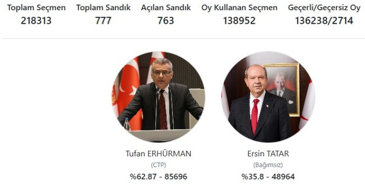 KKTC’de yapılan cumhurbaşkanlığı seçiminde, resmi olmayan sonuçlara göre Cumhuriyetçi Türk Partisi (CTP) adayı Tufan Erhürman, oyların yüzde 62,76’sını alarak yeni Cumhurbaşkanı seçildi. Mevcut Cumhurbaşkanı Ersin Tatar ise yüzde 35,80 oy aldı. Türkiye Cumhuriyeti Cumhurbaşkanı Recep Tayyip Erdoğan, “KKTC’nin ve Kıbrıs Türkü’nün yanında olmaya devam edeceğiz” dedi.