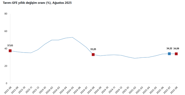 ANKARA (İGFA) – TÜİK’in verilerine göre, Ağustos 2025’te Tarım-GFE’de (2020=100), 2025 yılı Ağustos ayında bir önceki aya göre yüzde 1,30 artış, bir önceki yılın Aralık ayına göre yüzde 23,81 artış, bir önceki yılın aynı ayına göre yüzde 34,09 artış ve on iki aylık ortalamalara göre yüzde 31,94 artış gerçekleşti.