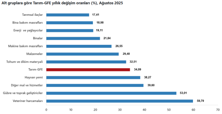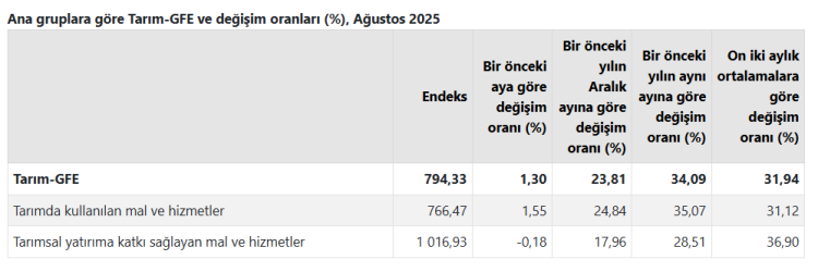 Türkiye İstatistik Kurumu (TÜİK), Ağustos 2025 Tarım Girdi Fiyat Endeksi’ni (Tarım-GFE) açıkladı.