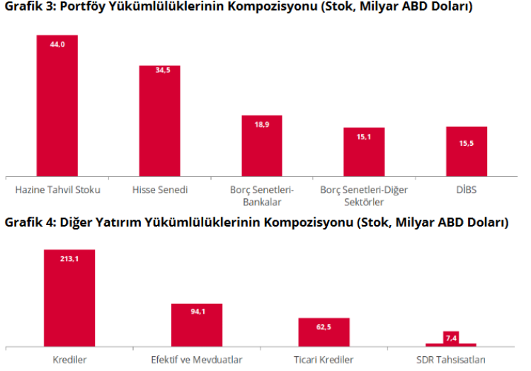 Varlık kalemlerinde doğrudan yatırımlar yüzde 1,1 artışla 71,6 milyar dolar olurken, diğer yatırımlar yüzde 1,2 azalışla 132,6 milyar dolar, bankaların YP efektif ve mevduat varlıkları ise yüzde 2,6 azalışla 39,8 milyar dolar oldu.