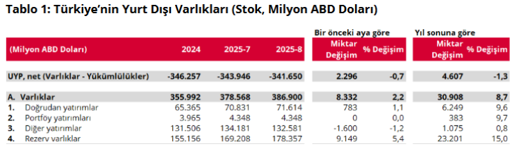 Merkez Bankası, Ağustos ayına ilişkin UYP istatistiklerini açıkladı. Türkiye’nin net UYP’si eksi 341,7 milyar dolar olurken, rezerv varlıklar 178,4 milyar dolar ile rekor kırdı. Yurt dışı varlıklar yüzde 2,2 artarken, yükümlülükler ise yüzde 0,8 arttı. Net UYP’nin negatif seyri dış finansman ihtiyacını yansıttı.