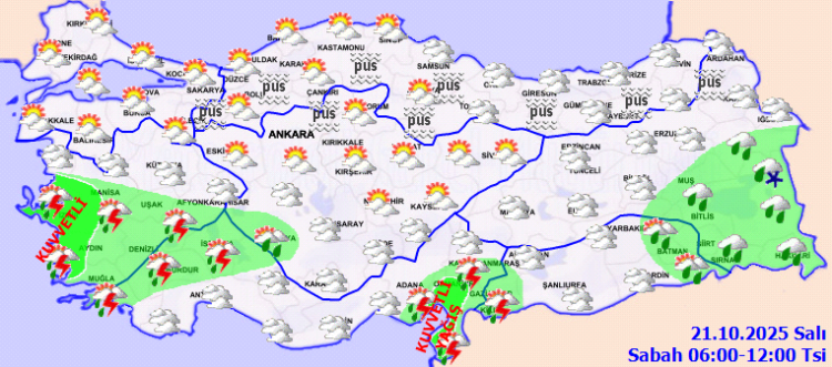 Özellikle Kıyı Ege, Osmaniye, Hatay kıyıları, Bitlis, Şırnak ve Siirt çevreleri ile Van ve Hakkari’nin batı ilçelerinde yerel olarak kuvvetli sağanak yağışlar beklenirken, hava sıcaklıklarının mevsim normalleri civarında seyretmesi beklendiği, rüzgarın da genellikle güney ve doğu yönlerden hafif, zaman zaman orta kuvvette eseceği tahmin edildi.