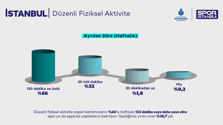 Dünya Sağlık Örgütü’ne göre haftada bir 150 dakika ve üstü -örneğin tempolu yürüyüş- fiziksel aktivite yapan insan, hareketli sayılmaktadır. Buna göre İstanbul’da kadınların yüzde 35,3’ü, erkeklerin ise yüzde 39,3’ü düzenli fiziksel aktivite yaparak, hareketli sınıfına giriyor. Düzenli fiziksel aktivite yaptığını söyleyen kişilerin yüzde 66’sı haftada 150 dakika ve üstü egzersize vakit ayırıyor. Bu 2023’te bu oran sadece yüzde 38,7’ydi. Araştırmaya göre en az egzersiz yapanlar 65 yaş üstü, en hareketliler ise 18-25 yaş aralığındaki kişiler oldu.