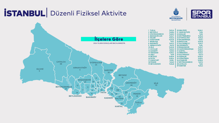 İBB Spor İstanbul’un 39 ilçenin fiziksel aktivite oranını ölçtüğü araştırmasının sonuçları belli oldu. 2024 Fiziksel Aktivite Araştırması’na göre İstanbul’u en hareketli ilçesi Tuzla oldu. Şehrin ortalama hareketlilik oranı ise 2.2 puanlık artışla yüzde 37.1’e yükseldi.